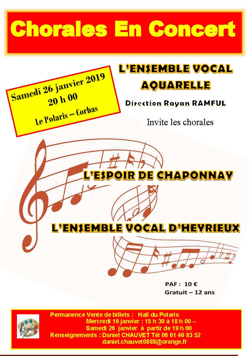 Le Chœur de la Fabrique sera en concert le samedi 26 janvier à 20h à Corbas à l’invitation de l’ensemble vocal Aquarelle et en compagnie de la chorale L’Espoir de Chaponnay. Lors de cette soirée entièrement consacrée au chant, les trois ensembles se produiront sur la scène du Polaris pour offrir un programme varié de pièces classiques, traditionnelles et de variété. Un bel événement en perspective.