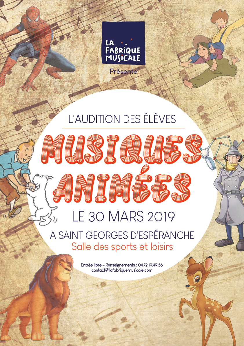 L’audition annuelle de La Fabrique musicale se tiendra le samedi 30 mars à 18h00 à la Salle sports et loisirs de Saint-Georges d’Espéranche. C’est sur le thème des musiques de dessins animés que le programme a été préparé depuis plusieurs semaines par les élèves et les professeurs de La Fabrique musicale.