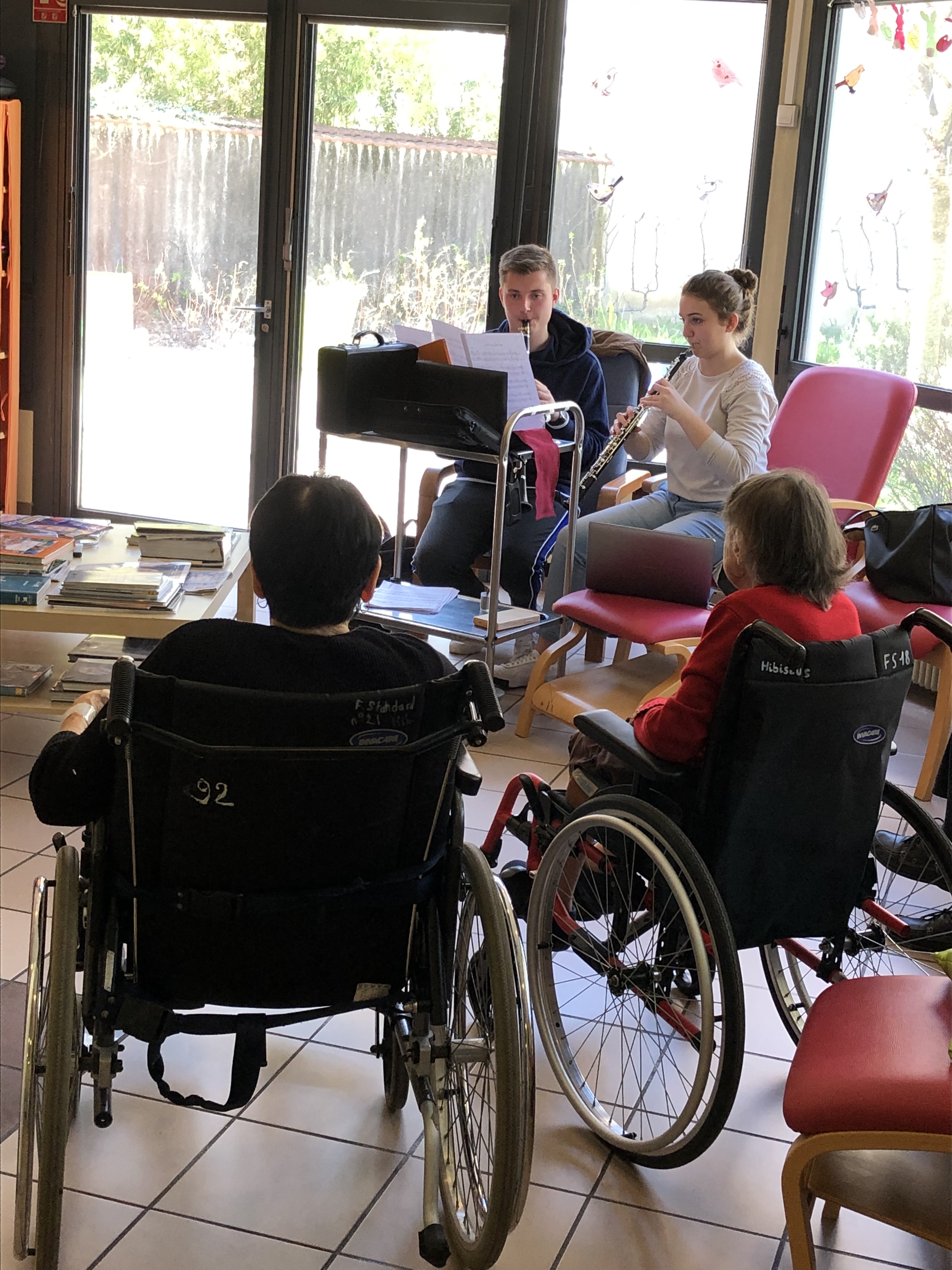 Lundi 25 mars, Coline Buisset, professeure de hautbois de la Fabrique, et Alexis Valverde, clarinettiste à l’Harmonie d’Heyrieux, étudiant au CRR de Lyon, sont intervenus au sein de l’unité de vie Alzheimer de la résidence Les Hibiscus à Lyon. Installés dans l’espace central de l’unité, ils ont joué et travaillé des duos pendant 40 minutes. « Le dispositif n’est pas tourné vers la représentation, comme pour un concert classique, explique Noëlle Bonnetain, médecin gériatre à l’origine de l’expérience. Il s’agit de laisser aux patients la liberté de réagir à la présence musicale. » Dès que la musique s’est fait entendre, les personnels soignants ont constaté l’arrêt des déambulations intempestives. Certains résidents se sont mis à battre la mesure ou à simuler le jeu du piano. « C’est spectaculaire de voir comment la musique apporte instantanément l’apaisement, ce qui est essentiel dans le quotidien des malades d’Alzheimer », raconte une infirmière.
