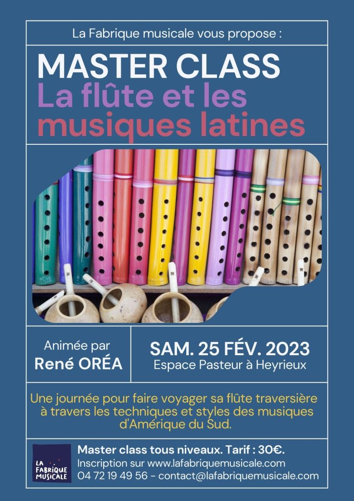 Le samedi 25 février 2023, La Fabrique musicale vous propose une journée pour faire voyager sa flûte traversière à travers les techniques et styles des musiques d’Amérique du Sud. Cette master class originale est ouverte à tous, débutants comme confirmés.