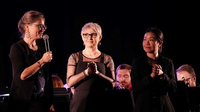 La soirée du 30 mars a essaimé ses grains de musique auprès des 300 spectateurs/auditeurs ravis devant une si belle collaboration artistique internationale, qui plus est féminine en cette journée internationale de la femme ! L’Orchestre d’Harmonie de La Fabrique musicale dirigé par Anastasia Masset, a présenté une partie de ses œuvres en nous faisant voyager de Robin des bois à West Side Story . Le Lyon Métropole Orchestra et sa cinquantaine de musiciens amateurs et professionnels, dirigé par Sucen Liu, a été l’invité d’honneur est a interprété ses succès indémodables Camino Real ou Baba Yaga. Cette rencontre musicale a accueilli également une artiste plasticienne, Svitlana Melobenska, qui a illustré en temps réel grâce à des animations sur sable quelques-unes des pièces présentées par les deux orchestres comme Winds of Change & Meridian et La grande porte de Kiev.